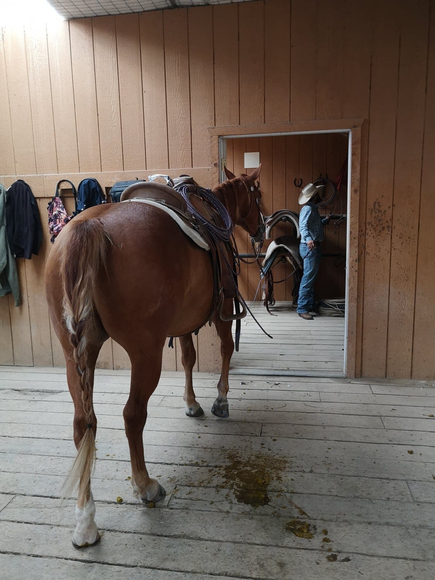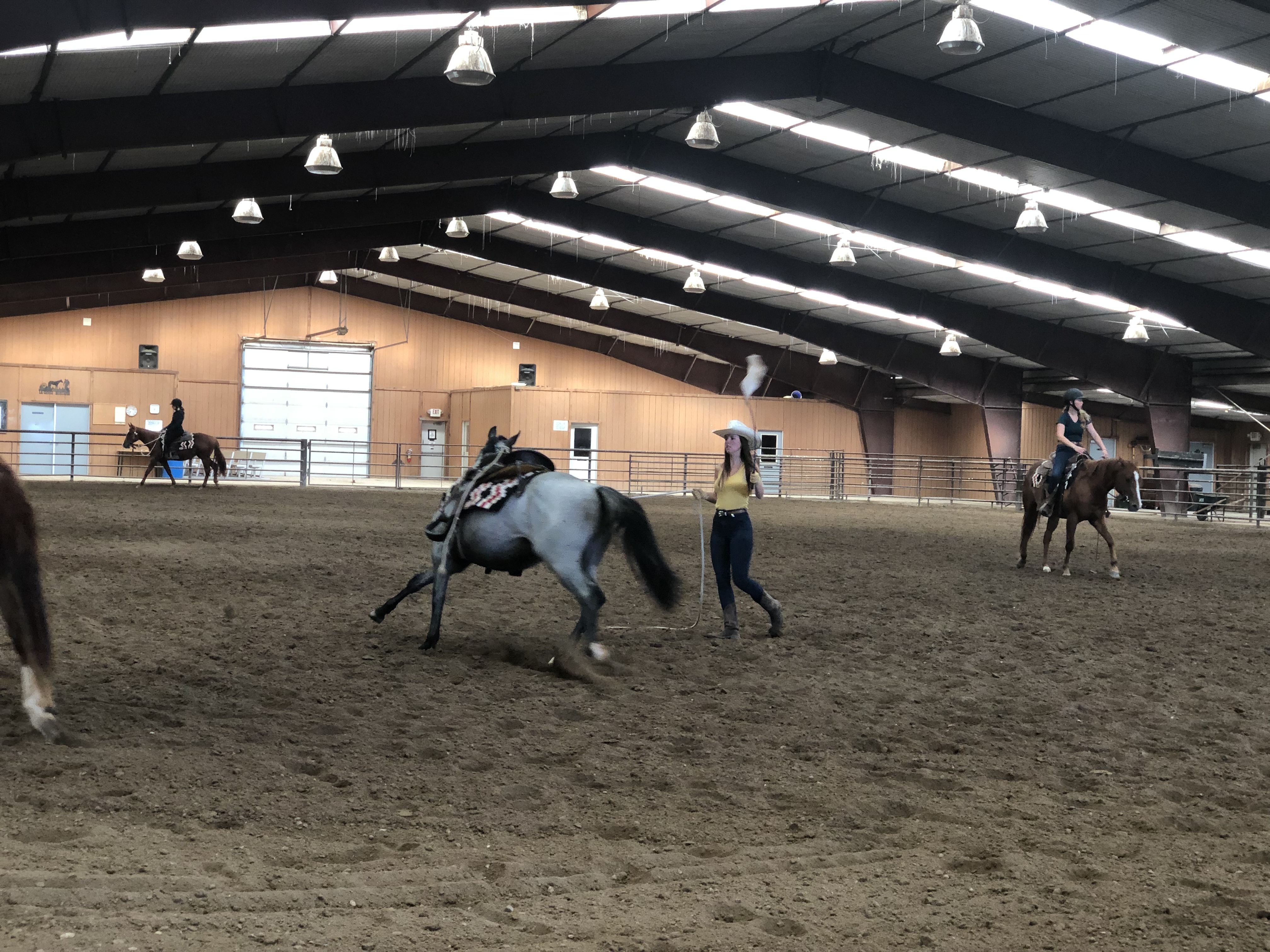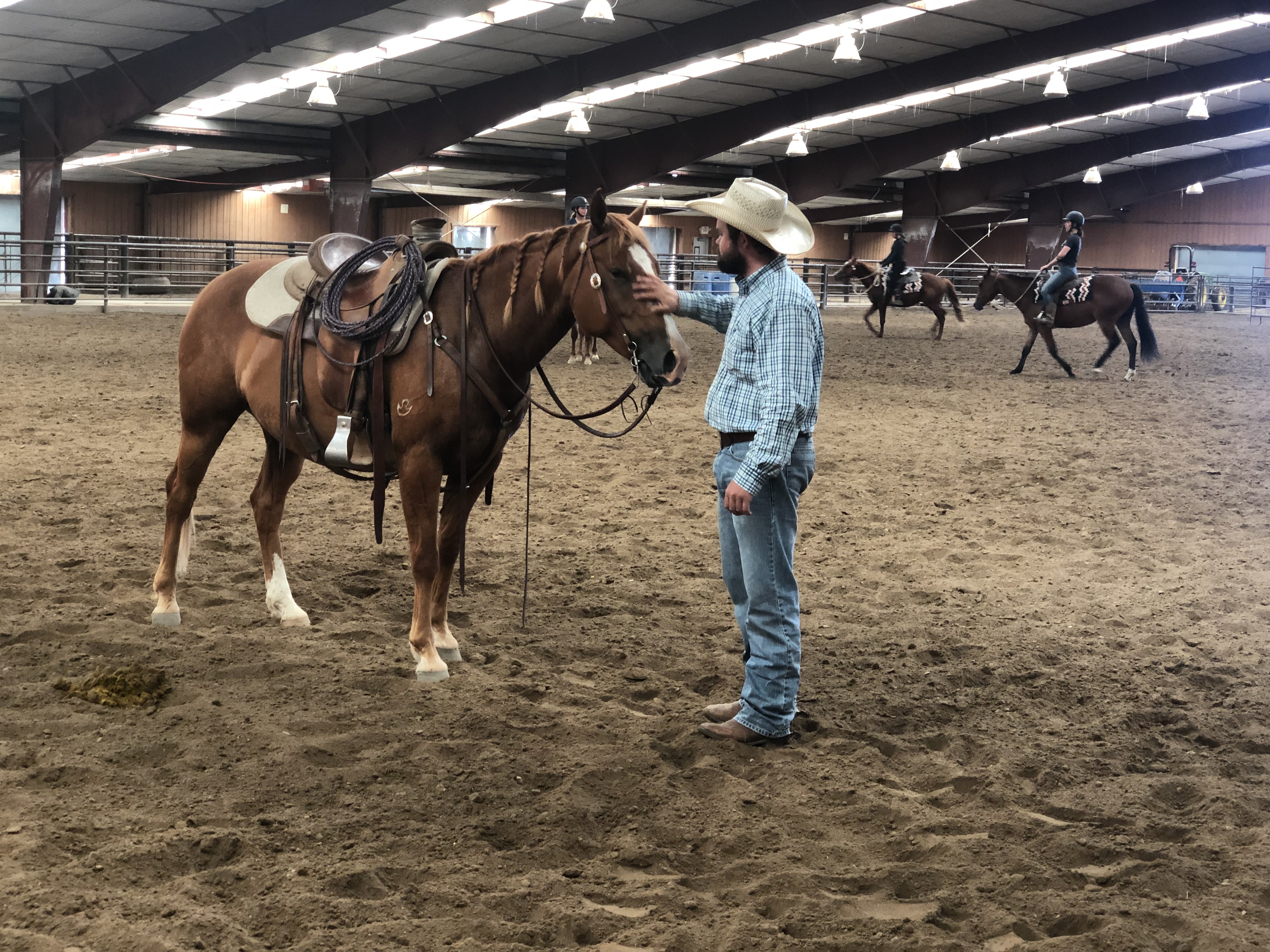 Ce matin, après être chercher des cadeaux pour Eric et Olie à Murdoch’s, base de tout bon cowboy, nous sommes retournés au Haras de la Cense pour faire de l’observation. Leurs étudiantes françaises ont désensibilisé puis monté les poulains de deux ans avant que ceux ci retournent pour un an au près après ce pré débourrage.