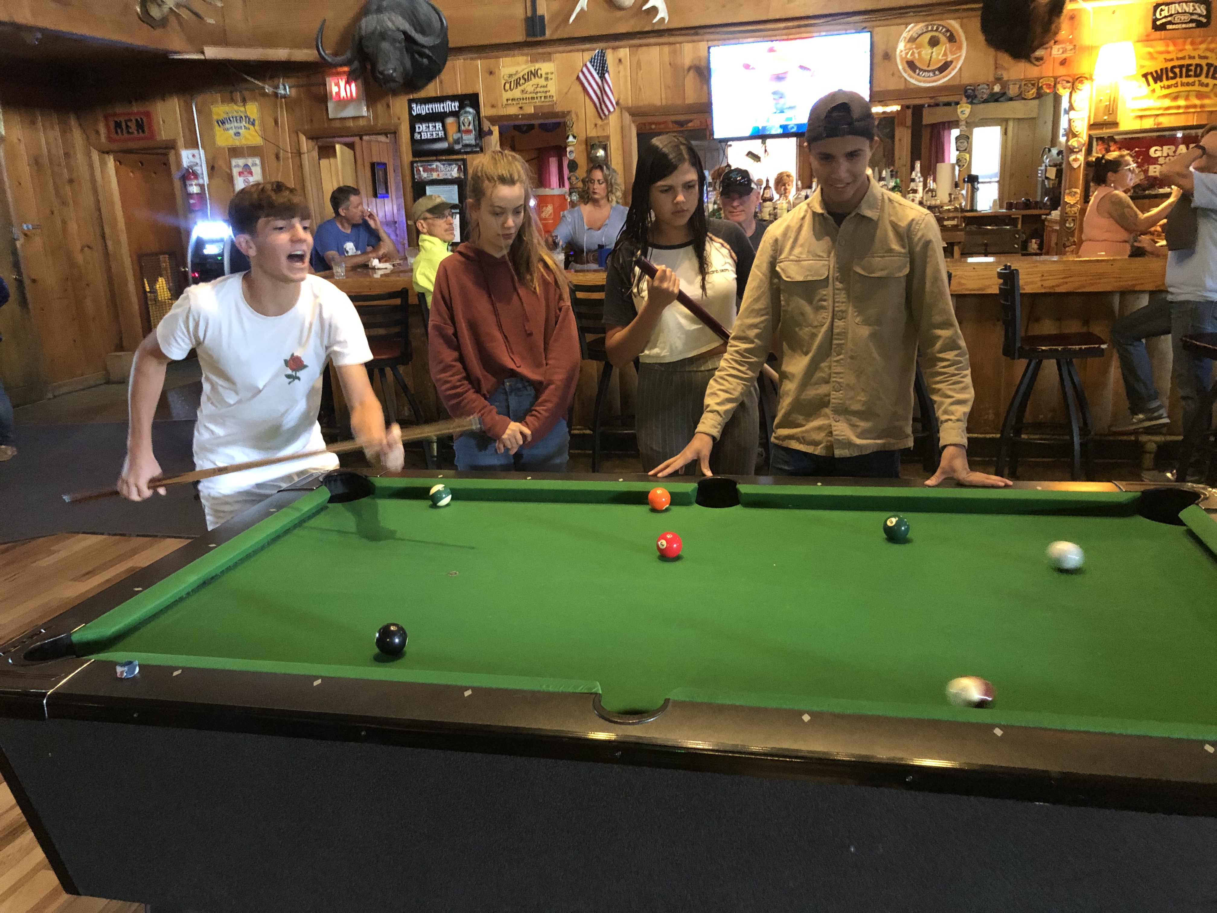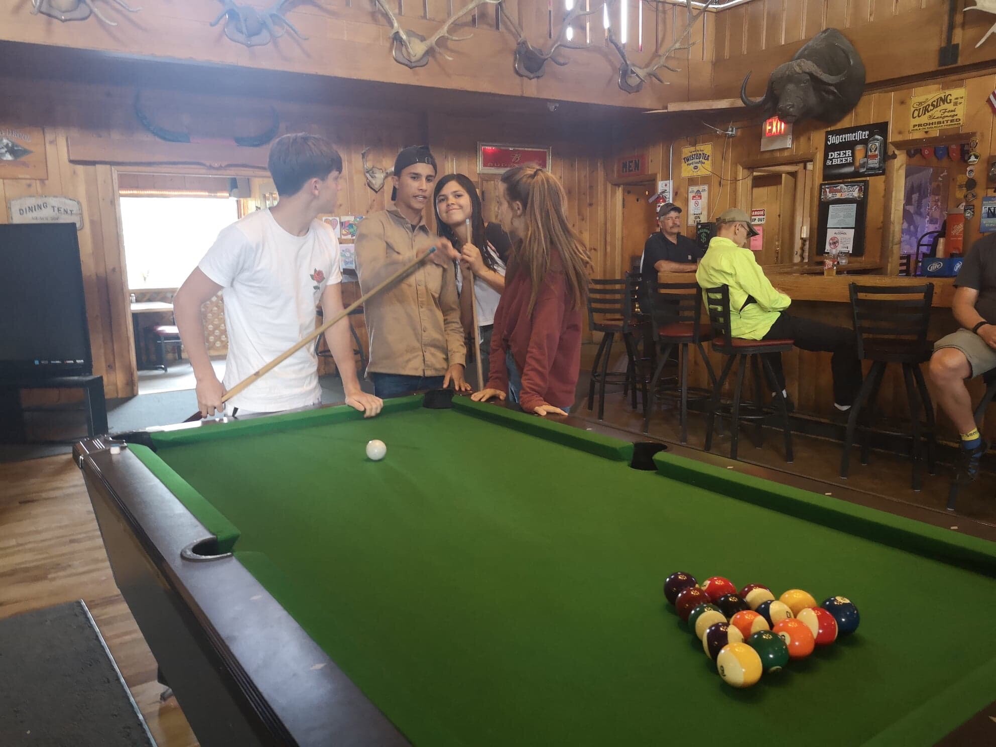 Après le déjeuner, nous avons été à des sources d’eau chaude, à Jackson une ville à 45 minutes de route, ce qui nous a fait beaucoup de bien. Ce lieu était très différent des Hotsprings ou nous avions été précédemment: dans un chalet très agréable et reposant, décoré de trophées de chasse de tous types d’animaux, nous avons pu profiter d’un bon bain chaud sous une douce pluie. On y a bien ri et nous avons clos cette visite par un bon jus de fruit et un billard dans le si joli chalet.